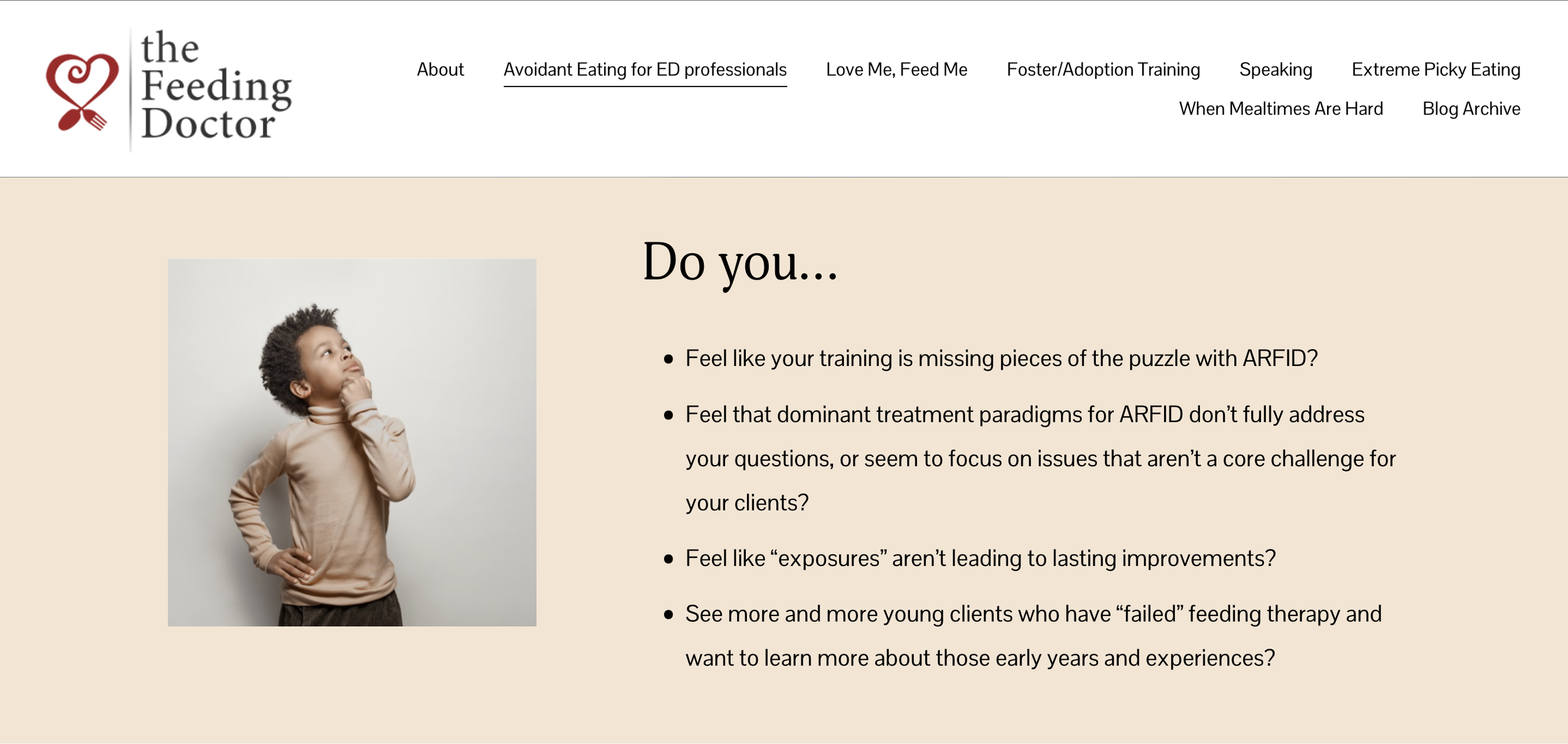 The Feeding Doctor | A Lifespan Understanding of Avoidant Eating (including ARFID) for Eating Disorder Professionals. This 9 hour, 6-session course is from a Responsive Feeding and Therapy (RFT) lens, prioritizing felt safety and individualized care, intrinsic motivation and autonomy.